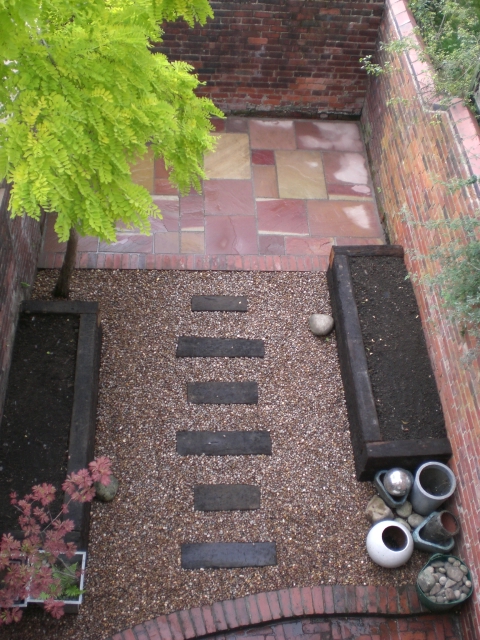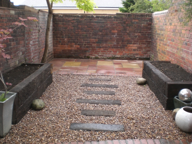 This design and build landscaping project was in Woodseats Sheffield it was on a typical 1900's terraced house with a small rear garden 50m2 and small front garden. The customer had heard good things about one of sheffields premier landscape gardeners and decided to meet with us. The customer had a very tired overgrown garden that was unuseable. We started out by finding out what sort of materials they liked and we decided on using: Indian Stone in the colour Modak for the patio. Reclaimed imperial red bricks for edgings to match the house. 20mm pebbles as a cheap way of covering large areas. Reclaimed railway sleepers for raised flower beds and as stepping stones across the pebbled area. The garden boundary walls were repaired and topped with indian sandstone paving slabs in the same colour as the patio. Once we had finished the back the customer asked us to renovate the front garden it was pretty simple we used weed fabric and 10mm pebbles. We also used Indian sand stone flags on the front garden but decided on a different colour so we went for a blue/grey indian sand stone and used the original rope top patio edgings with reclaimed red brick step so it all ties in nicely. If you have a landscaping project in mind, please call us. We are a highly recommended landscape gardener that can cater for all your needs 07596493021