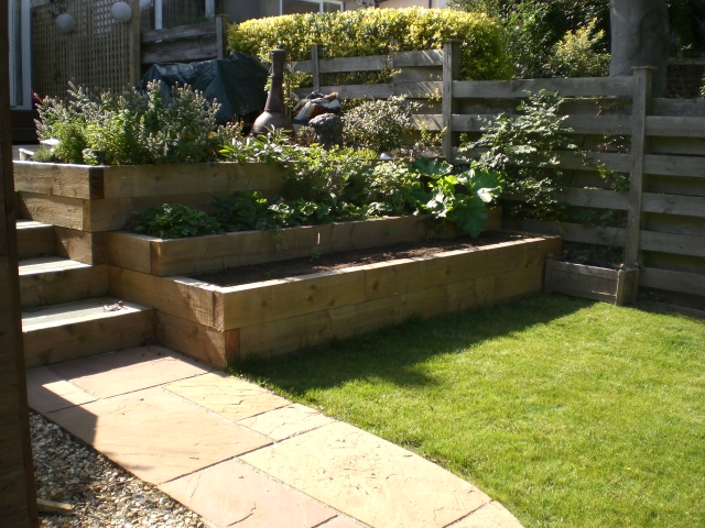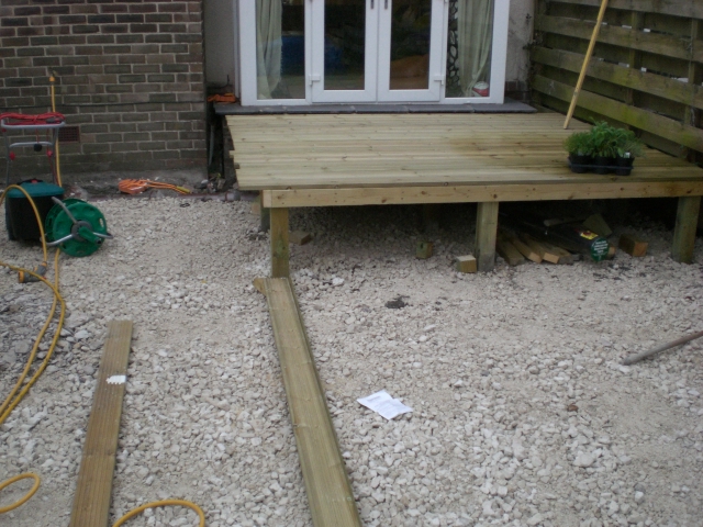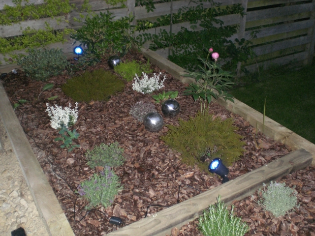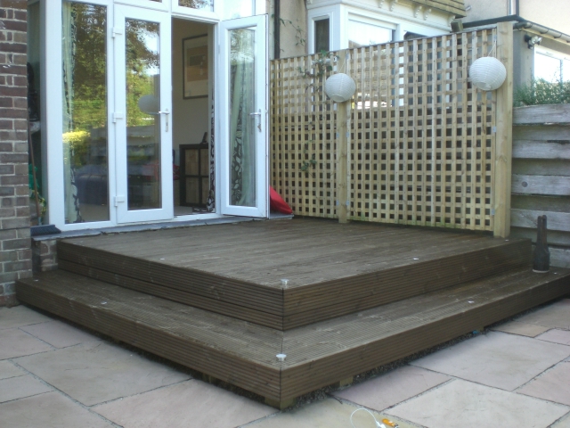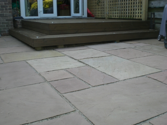 This landscaping project was in Bradway Sheffield S17. The job was part of a full property renovation. The garden was totally unuseable due to drainage issues on the lawn. To dry the lawn area out there was 100 metres of land drain installed and also 20 tonnes of pea gravel and 20 tonnes of new high quality top soil were spread on the site. There was an Indian stone patio and path laid on mortar beds on compacted type 1 sub base. There were two decking areas created one being raised just at the back patio doors and another in front of the summer house. The decking outside the patio doors stepped down on to an L Shaped Indian stone patio. The decking areas are also lit up by outdoor LED lighting.